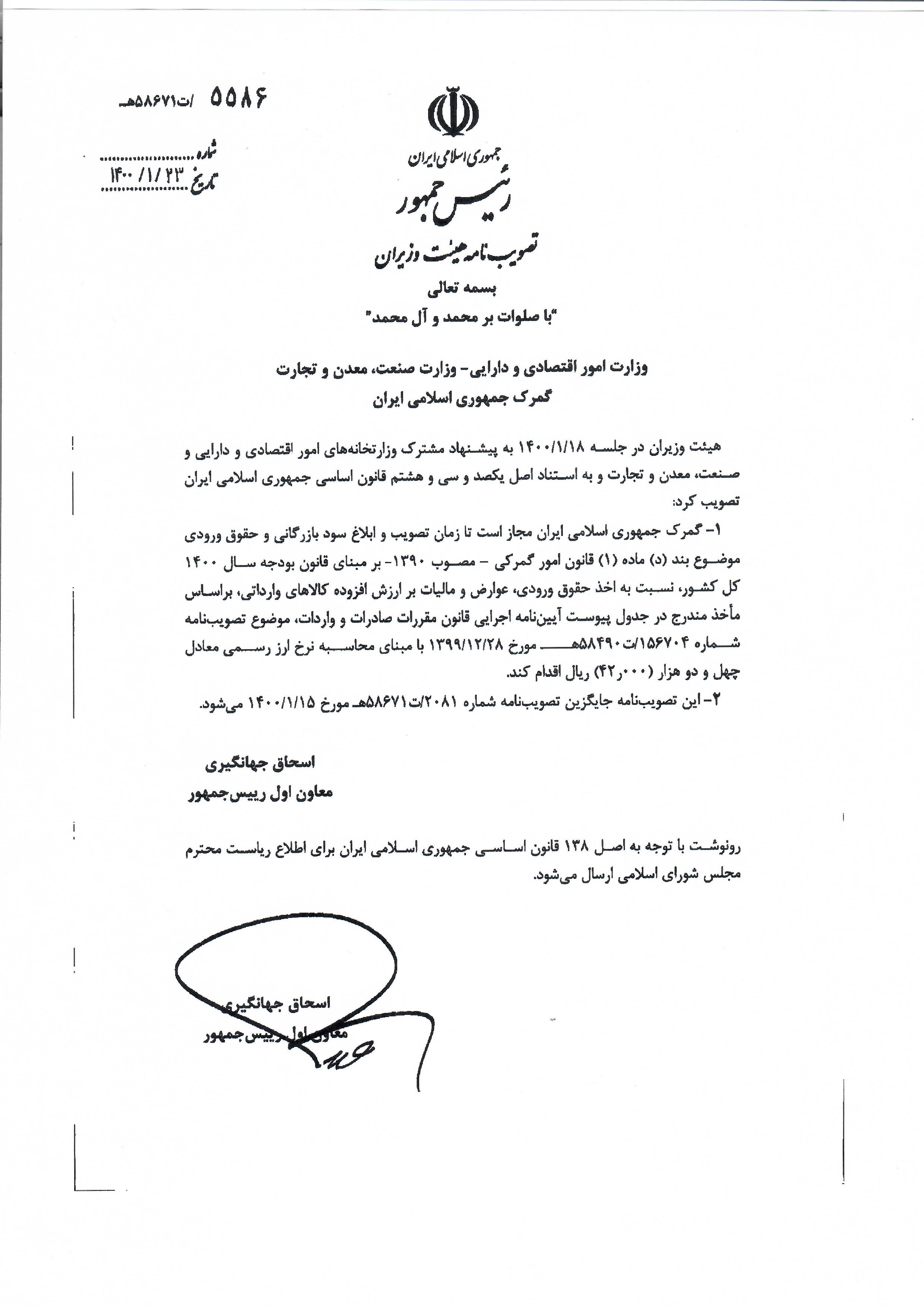 با تصویب هیات وزیران جمهوری اسلامی ایران، گمرک جمهوری اسلامی ایران مجاز است تا زمان تصویب و ابلاغ سود بازرگانی و حقوق ورودی قانون امور گمرکی بر اساس نرخ ارز ۴۲ هزار ریال اقدام نماید.